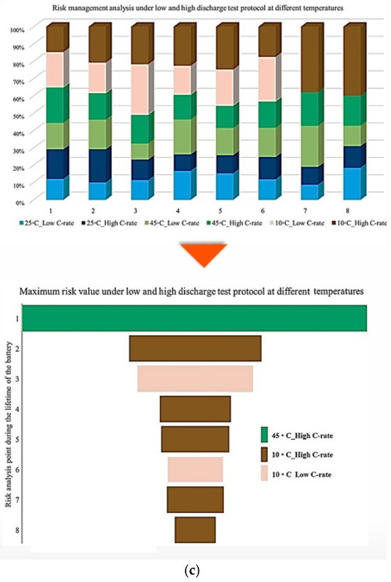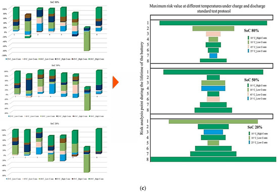 Additionally, Figure 7 illustrates the contribution of each battery under standard charge conditions with low and high discharge currents at various temperatures, considering three SoC levels to capture how Rint develops over battery lifetime as operating conditions change. From the results, the contribution to PF associated with Rint increase during battery lifetime under 25 °C/Low C-rate, 25 °C/High C-rate, 45 °C/Low C-rate, 45 °C/High C-rate, 10 °C/Low C-rate, and 10 °C/High C-rate reaches 30% at the 3rd point, 20% at the 3rd and 4th points, 20% at the 3rd and 6th points, 20% at the 5th point, 40% at the 2nd point, and 50% at the 1st risk analysis point, respectively. When the SoC is fixed at 50%, the maximum contribution of PF is observed as 40% at the 4th point, 50% at the 2nd point, 40% at the 6th point, 10% at the 6th point, 50% at the 8th point, and 50% at the 1st and 8th risk analysis points for the same temperature and discharge-rate combinations. At 20% SoC, the corresponding maximum contributions increase to 20% at the 3rd point, 30% at the 2nd point, 20% at the 3rd point, 10% at the 5th point, 40% at the 1st and 6th points, and 90% at the 8th risk analysis point. The most significant contribution to PF is associated with the 10 °C/high C-rate condition. In contrast, the lowest participation in PF-related risk is consistently noted at 25 °C over the battery lifetime.