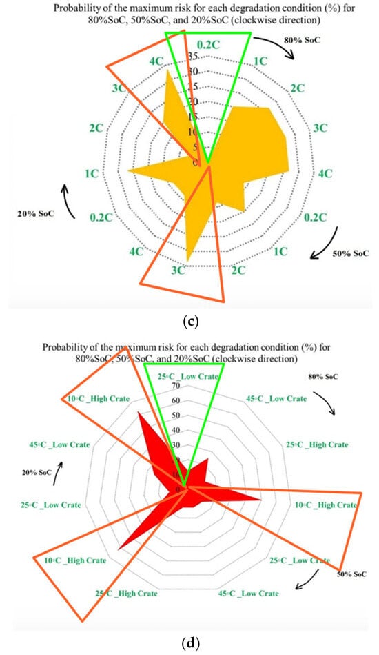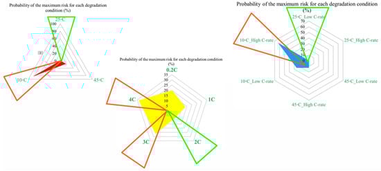 where represents the risk contribution ratio of the operating condition for indicator at risk point , and denotes the corresponding indicator value. At each risk point, the operating condition exhibiting the highest percentage contribution is identified as the dominant contributor. The probability distributions presented in the manuscript are empirical frequency-based distributions, obtained by counting the frequency with which each operating condition represents the maximum contributor across all selected risk analysis points. The normalization reference corresponds to the nominal operating condition specified in the cell datasheet (1 C charge, 1 C discharge, and 25 °C), which is used consistently as a baseline for comparison. Normalization by cumulative equivalent throughput was not applied, as the objective of this study is comparative risk ranking across operating conditions rather than absolute lifetime prediction.