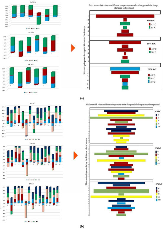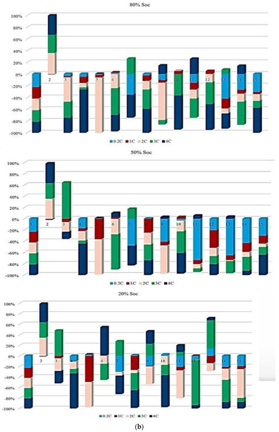 Figure 7 illustrates the contribution of each battery to Rint change under standard charge conditions, considering different TPCs and three SoC levels, and the results reflect how Rint changes over battery lifetime when operating conditions transit from one state to another. The contribution to PF associated with Rint increase during the battery lifetime at C/2, 1 C, 2 C, 3 C, and 4 C reaches 20% at the 12th and 14th points, 50% at the 4th and 7th points, 40% at the 2nd, 5th, and 11th points, and 45% at the 10th risk analysis point, respectively. When the SoC is fixed at 50%, the maximum contribution of PF occurs at 20% (14th point), 45% (4th point), 50% (7th point), 40% (2nd, 5th, and 11th points), and 50% (11th point) for C/2, 1 C, 2 C, 3 C, and 4 C, respectively. At 20% SoC, the corresponding maximum contributions are observed as 30% (14th point), 40% (5th point), 50% (7th point), 40% (13th point), and 60% (10th point). Considering the evolution of risk trends in this section, discharge at C/5 shows more stable behavior at 50% SoC compared with 80% and 20% SoC conditions. However, the most obvious variations in Rint-related risk are associated with the 2 C condition throughout the testing period.