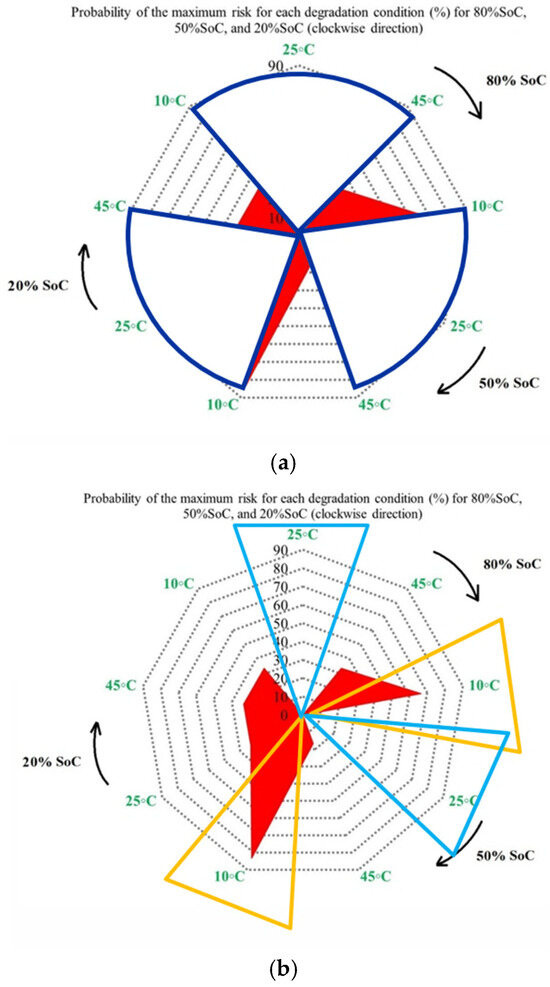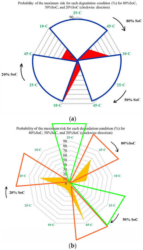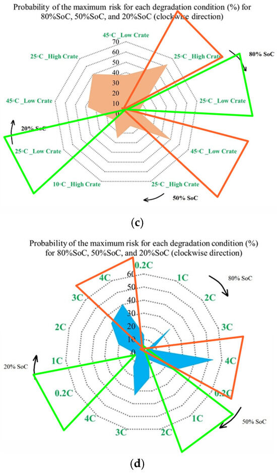 It is also evident that the changes in maximum risk at 10 °C occur more abruptly than under other operating conditions, indicating a stronger sensitivity of Rint increase to low-temperature operation. The probability of maximum risk occurrence for each degradation condition at 80%, 50%, and 20% SoC under low and high discharge currents is also given in Figure 6. The analysis shows that the highest risk at both 80% and 50% SoC is dominated by the 10 °C/high C-rate condition, while at 20% SoC, the second highest risk corresponds to the 10 °C/low C-rate case. These results validate that low-temperature operation represents the most critical condition in terms of PF risk for the investigated NMC Li-IBs. Moreover, no maximum-risk contribution is observed for the 25 °C and 45 °C/high C-rate cases at 80% and 50% SoC, nor for the 25 °C case and both 45 °C discharge conditions at 20% SoC.