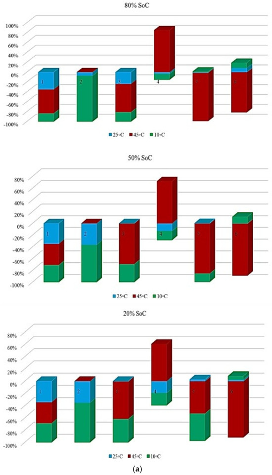 Figure 7 illustrates the contribution of each battery to the change in the Rint at different ambient temperatures under standard charge/discharge TPCs, assessed at three SoC levels, to describe how Rint changes with temperature and cycling conditions as the battery transitions from one condition to another over its lifetime. It should be noted that in this study, all discussions of heat generation or thermal stress are inferred indirectly from the evolution of internal resistance and operating conditions, rather than from direct thermal measurements. Thus, based on the results provided in Figure 7, the highest contribution to PF associated with Rint evolution during the battery lifetime at 10 °C, 45 °C, and 25 °C reaches 20% at the 1st and 2nd risk analysis points, 50% at the 3rd point, and 25% at the 1st and 2nd points, respectively, and when considering the 50% SoC level, the maximum contribution to power fade during battery life at 10 °C, 45 °C, and 25 °C is observed to be 60% at the 2nd point, 80% at the 6th point, and 80% at the 2nd risk analysis point, respectively. However, at a lower SoC level of 20%, the influence of Rint increase on PF becomes more evident. In particular, the maximum contribution at 10 °C, 45 °C, and 25 °C reaches 80% at the 2nd point, 80% at the 3rd point, and 40% at the 5th risk analysis point, respectively. Thus, operation at 10 °C exhibits the highest participation in risk development, exceeding other temperature conditions by approximately 80% and 50% at different SoC levels.