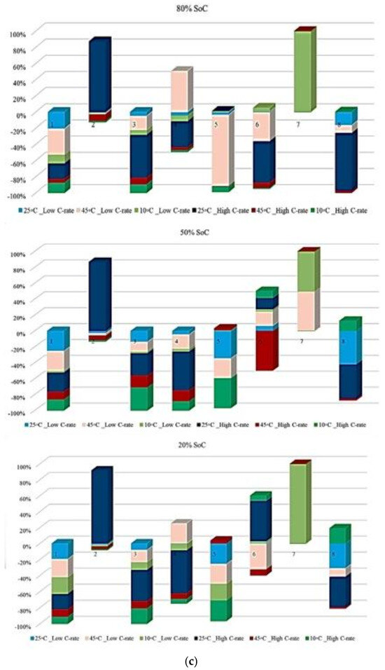 In Figure 9, the contribution of each battery to OCV variation under different degradation conditions is shown. The analysis is performed at three SoC levels, and the results reflect the evolution of OCV-related risk over the battery lifetime. In Figure 9, it is clarified how strongly OCV variation contributes to degradation over the battery’s life. Figure 9a illustrates the OCV contribution at the three temperatures selected in this study under standard charge/discharge conditions, and the results show that the highest OCV-related risk appears at 45 °C and 10 °C, particularly at mid- and late-life inspection points, and at 25 °C, the contribution remains limited, indicating a more stable electrochemical equilibrium, which confirms that temperature extremes accelerate voltage instability, especially at reduced SoC levels. Figure 9b shows this contribution at standard temperature for different discharge C-rates, in which high C-rates, 3 C and 4 C, exhibit obvious OCV fluctuations, especially at 20% SoC, where the electrochemical system becomes more sensitive to polarization effects. However, C/2 and 1 C reveal smaller contributions, indicating reduced voltage instability over time. Then, Figure 9c presents OCV variation under low and high discharge C-rates at different temperatures, in which the most severe OCV deviations are observed at low temperature combined with high C-rate, followed by high temperature/high C-rate conditions. These operating routines, characterized by increased OCV variability, are associated with conditions that may induce higher electrochemical stress and irreversible energy losses, which have been widely reported in the literature to correlate with degradation phenomena such as loss of cyclable lithium, SEI-related effects, and electrolyte decomposition.