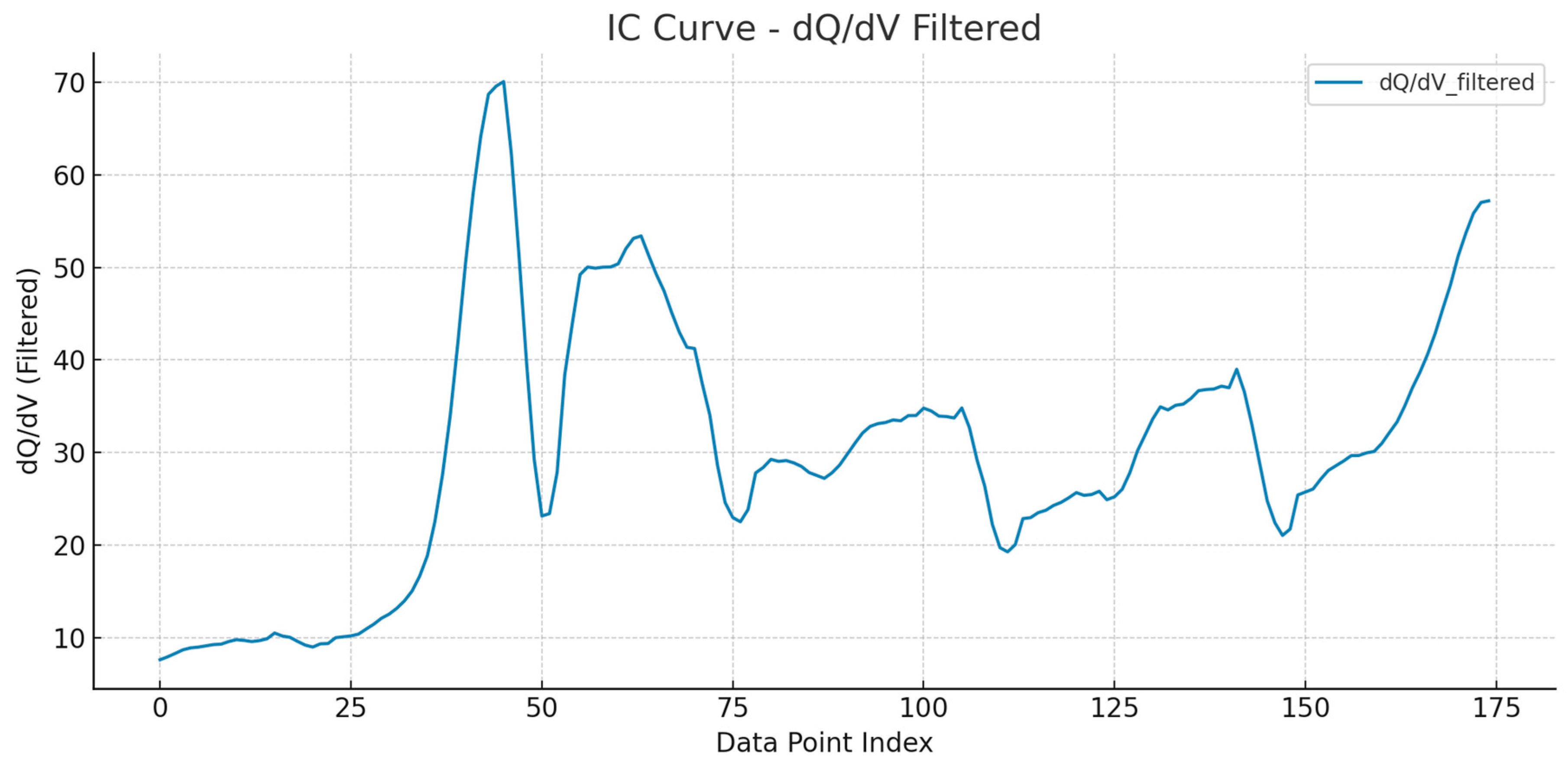 10] was applied to each usable charge cycle from the Loughborough Sweat Test, Oxford, and Nature datasets. This prior study systematically evaluated the influence of smoothing, differentiation, and filtering parameter choices on IC curve stability and signal integrity and established a processing procedure that balances noise suppression with retention of degradation-relevant structure. This approach ensured a unified set of IC curves for subsequent feature extraction and analysis.