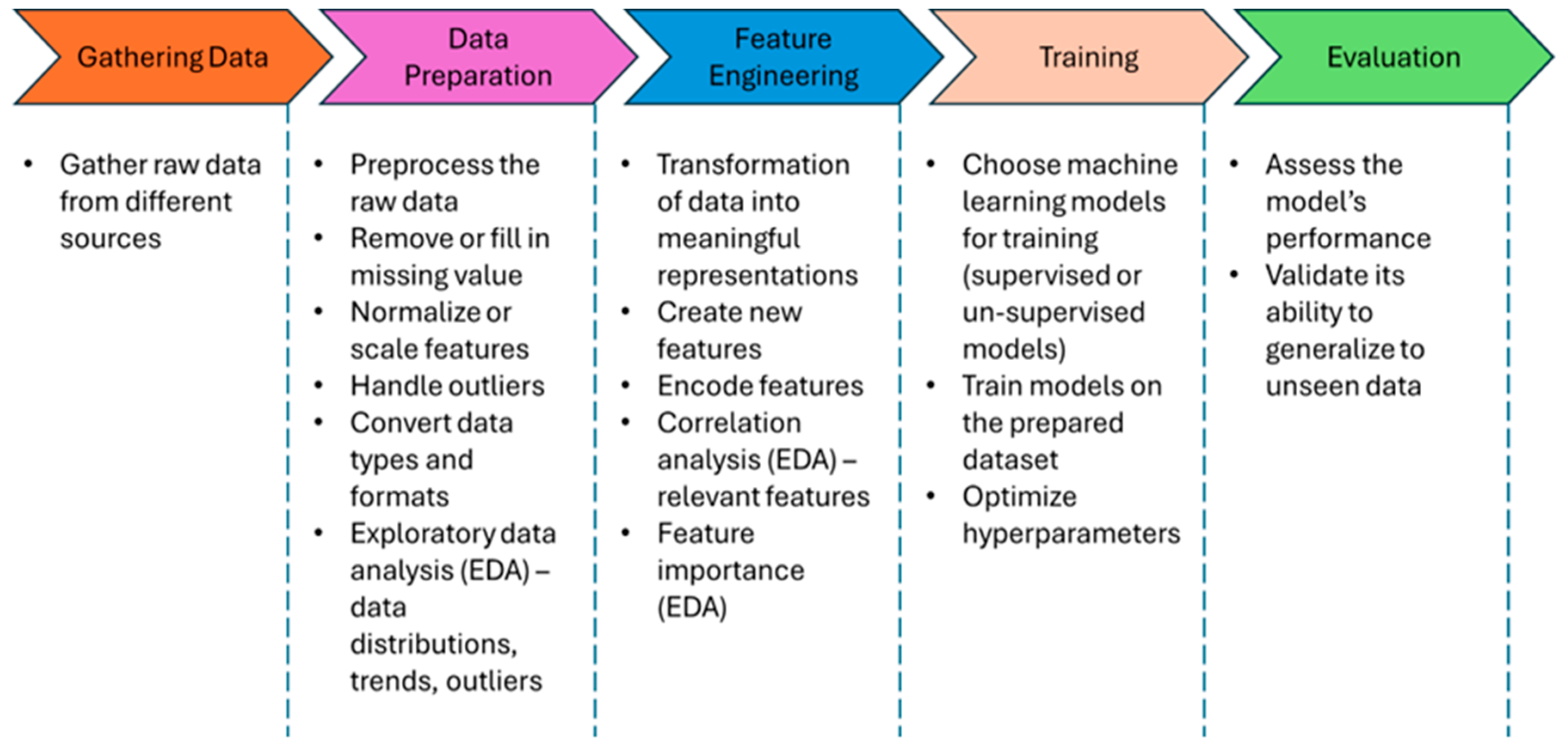 Figure 3. In this study, only the data preparation, feature engineering, and exploratory analysis stages are covered. Supervised model training and evaluation will be presented in a separate follow-up paper. The following sub-sections describe the cleaning, feature engineering, and scaling processes applied to the aggregated dataset prior to model development.