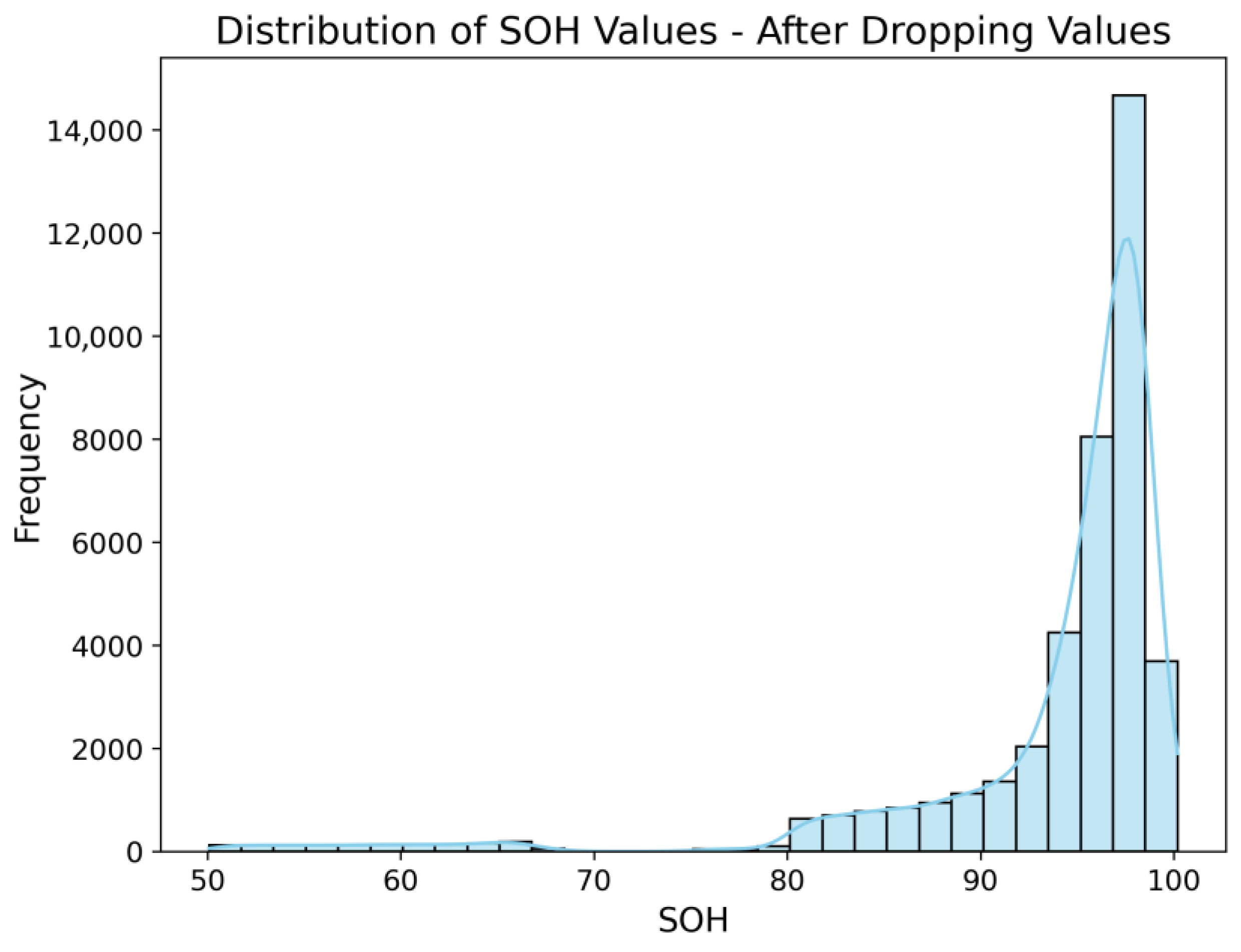 For K-means clustering, using three clusters yielded coarse groupings aligned with health trends but also revealed overlapping boundaries. HDBSCAN produced a finer segmentation and identified local groupings in the data while also assigning a large number of samples as noise. The presence of such uncertain or structurally atypical samples provides a key challenge when working with heterogeneous datasets, especially those involving SLBs with undocumented usage histories. To address this, a binary flag was introduced during preprocessing using a two-tiered IQR outlier detection system, designed to identify edge cases based on feature behaviour. HDBSCAN’s noise detection further complemented this strategy by flagging additional ambiguous samples, enabling more flexible treatment of uncertainty in the dataset.