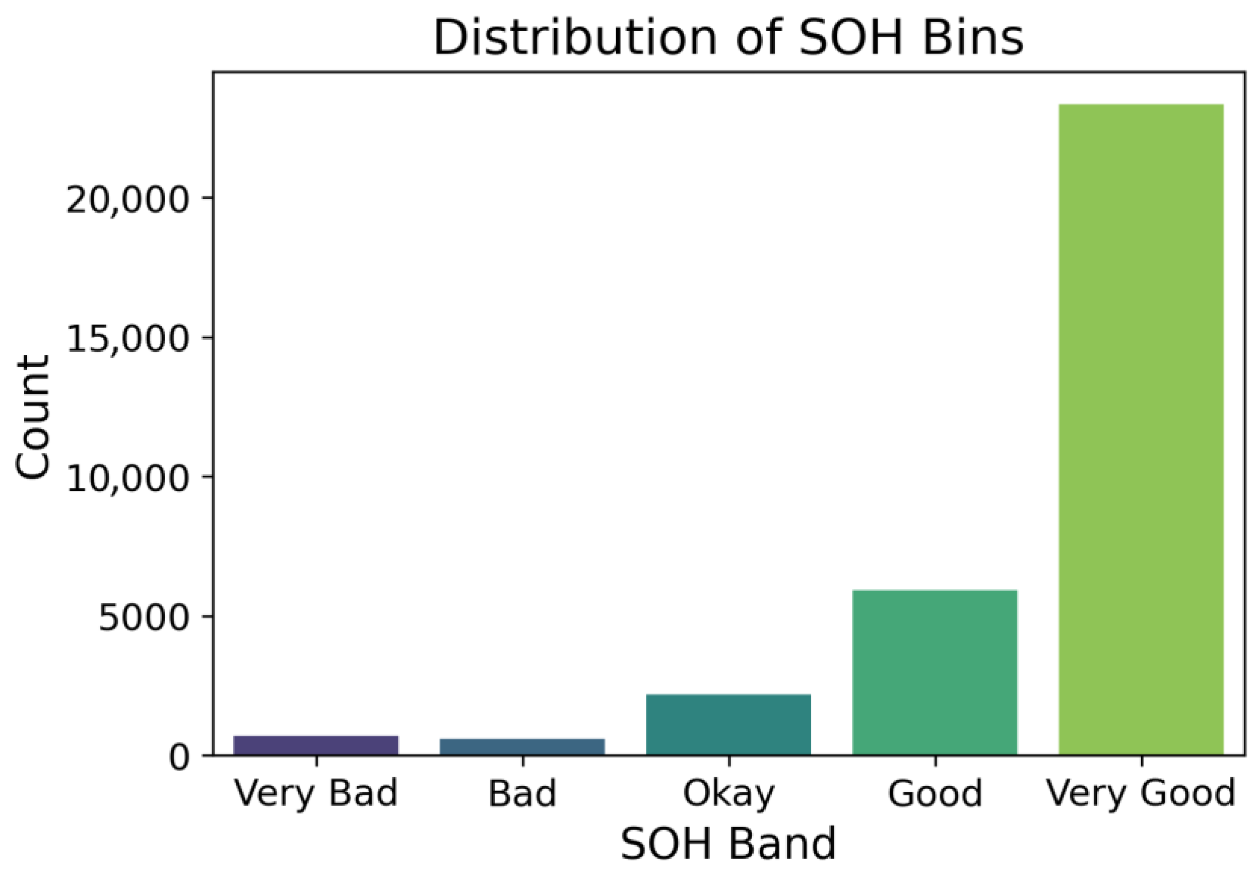 Table 9, cluster 2 was strongly associated with higher SOH bands. In particular, it contained over 72% of samples in Band 4 (Very Good) and a majority in Band 3 (Good). In contrast, the lower SOH bands (Very Bad to Okay) were distributed more evenly across all three clusters. This indicates that cluster 2 may reflect cells with stable or minimally degraded behaviour, while clusters 0 and 1 capture more deteriorated profiles.