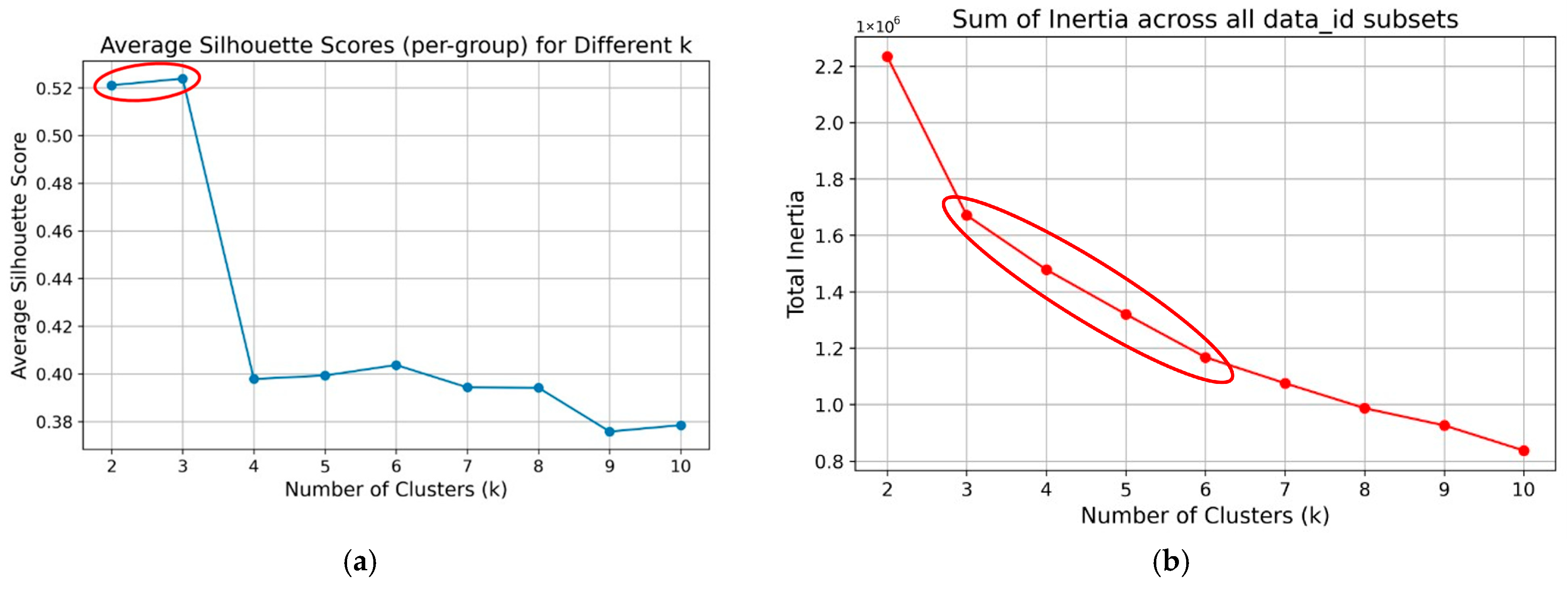 Clustering was applied separately to each data_id subset to account for different scales and operating conditions. For each candidate k, the following metrics were computed and averaged across subsets:
