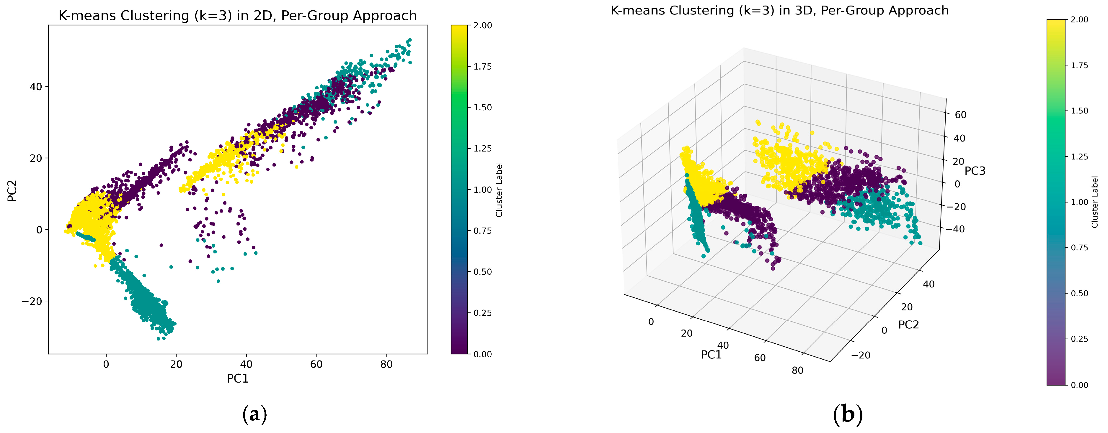 To evaluate structural patterns in the feature space, K-means clustering was applied with an optimal number of clusters selected as k = 3 based on the highest silhouette score and inertia analyses.