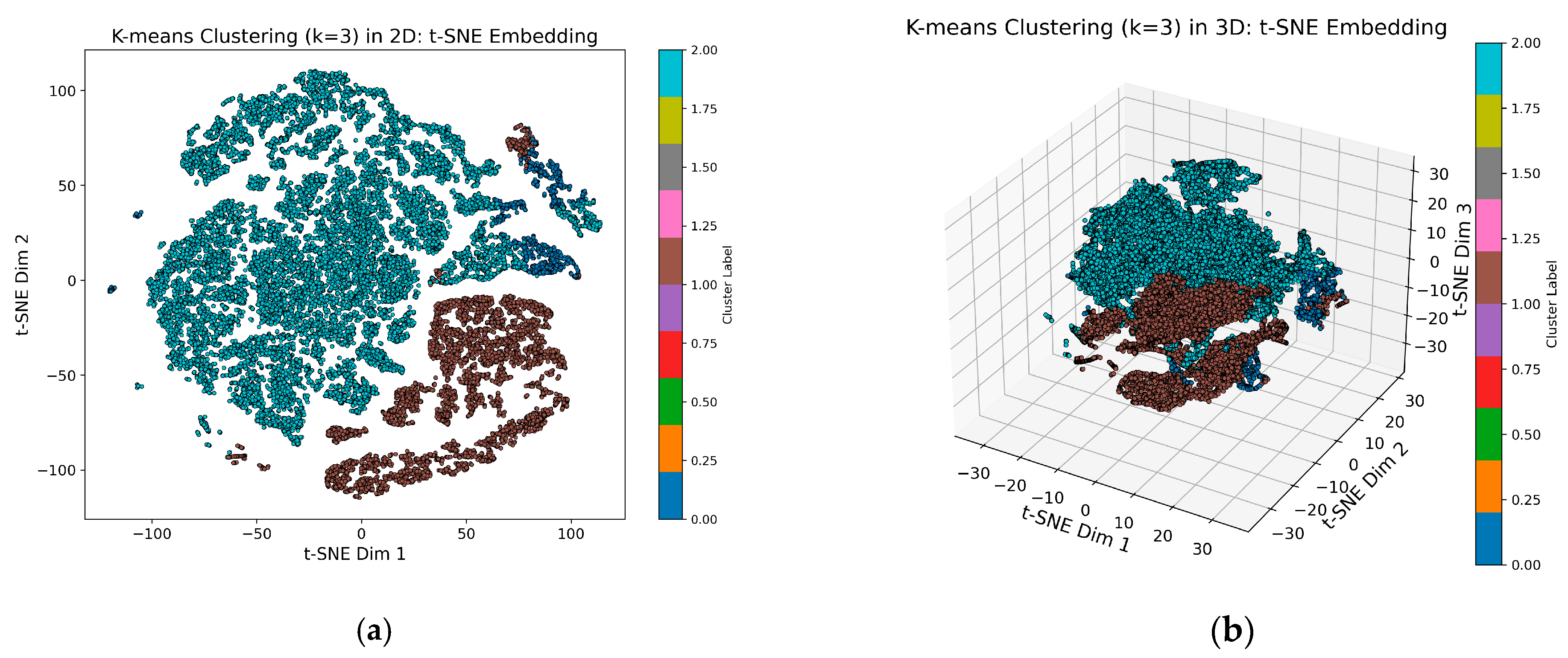 Figure 11a, cluster 2 appears to form a dense and cohesive group in the central area of the embedding, while clusters 0 and 1 occupy more scattered and peripheral zones. The compact island at the top right contains a mixture of labels from all three K-means clusters. This arises because t-SNE preserves local neighbourhoods but not global geometry, so regions that are separated along directions now shown in two dimensions can overlay in the 2D map. The island is, therefore, interpreted as a dense transitional zone across adjacent degradation states, consistent with overlap between neighbouring SOH bands. However, in the 3D t-SNE visualisation in