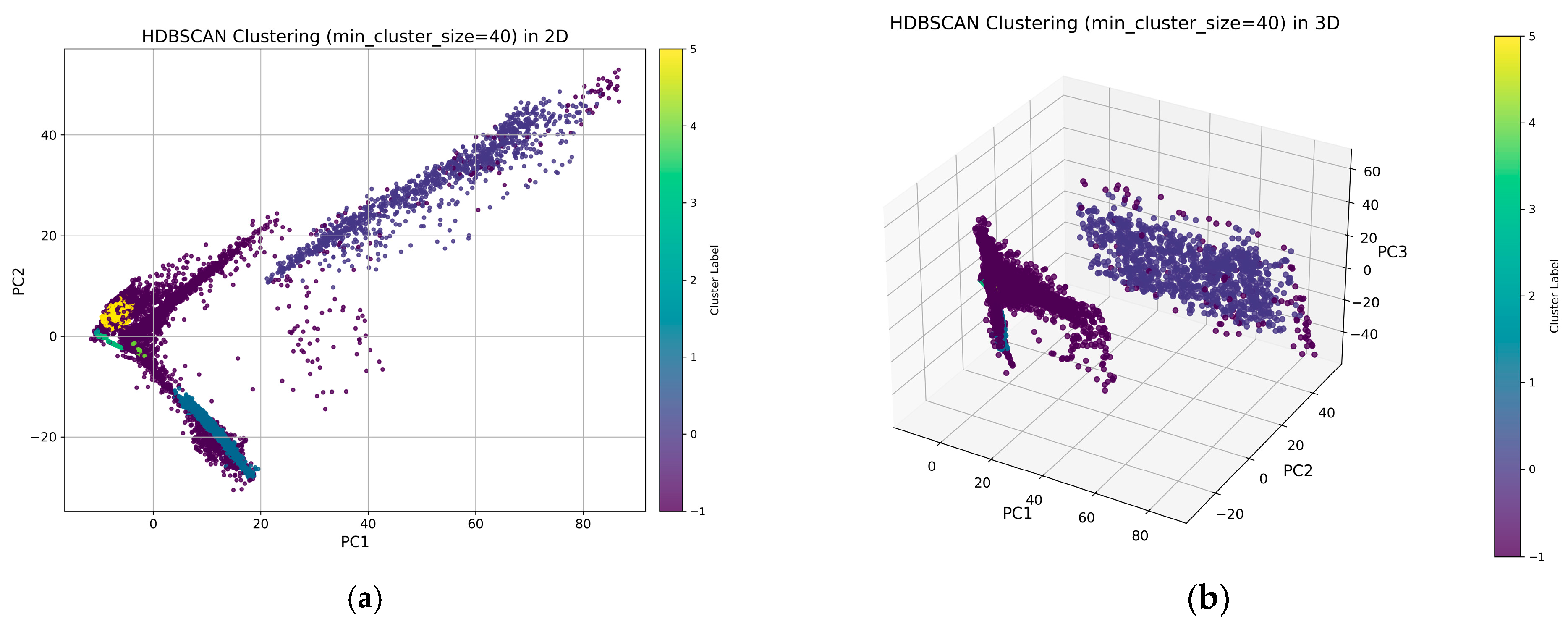 The best-performing configuration was selected based on a trade-off between cluster count and noise proportion. A setting of min_cluster_size = 40 produced seven clusters and 14.44% noise, offering a balance between resolution and robustness.