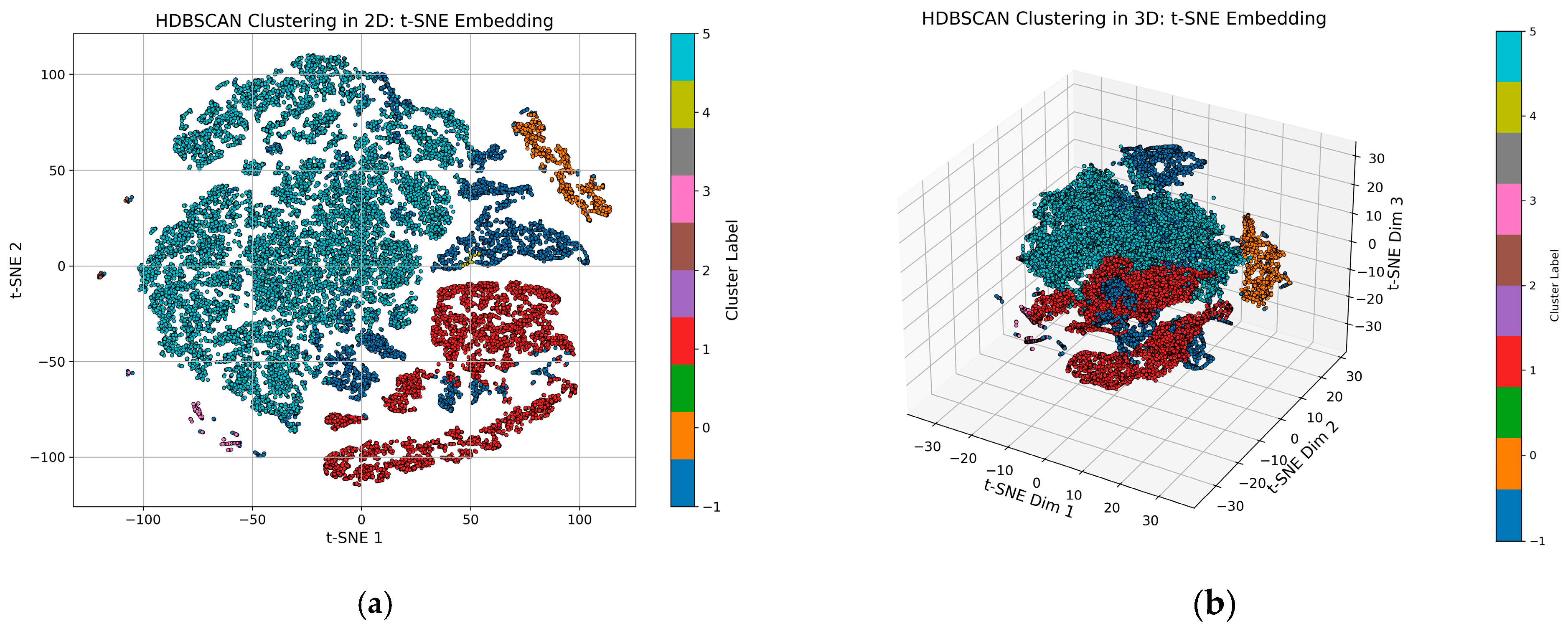 Figure 13 provides the t-SNE visualisations of the same clustering assignments. The 2D t-SNE plot reveals strong visual separation between several clusters. In particular, cluster 1 forms a dense central group, while clusters 2, 3, and 4 are distributed in distinct, localised regions. Although there is some overlap between clusters, the separation is clearer than in the PCA plots and suggests that HDBSCAN has effectively captured the underlying structure in the feature space. However, the 3D t-SNE projection shows increased overlap between clusters and a more interwoven spatial distribution. This indicates that the true structure is more complex than what is visible in 2D, with some clusters potentially residing along curved or nested manifolds in higher dimensions.