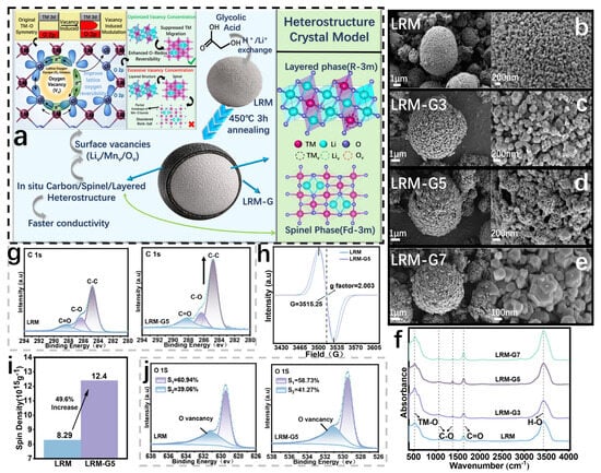 Surface engineering with glycolic acid: (a) Design concept [16]; (b–e) SEM images of LRM, LRM-G3, LRM-G5, and LRM-G7; (f) FTIR spectra of the samples; (g,j) XPS C1s and O1s spectra of LRM and LRM-G5; (h,i) EPR spectra of oxygen vacancies (h) and spin numbers comparison (i) in LRM and LRM-G5.