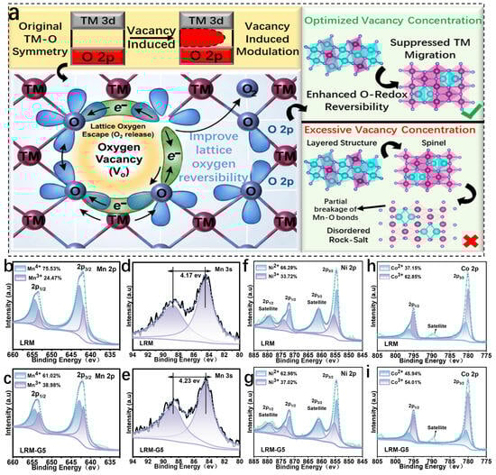 (a) Schematic illustration of the oxygen vacancy-mediated redox mechanism. Comparative XPS analysis of LRM and LRM-G5: (b,c) Mn 2p spectra; (d,e) Mn 3s spectra; (f,g) Ni 2p spectra; (h,i) Co 2p spectra.