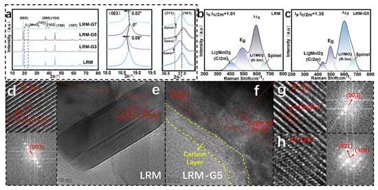 Raman analysis (Figure 3b,c) reveals an increased intensity ratio between the spinel-related band at ~680 cm−1 and the Li2MnO3-related band at ~420 cm−1 in LRM-G5 [37], providing additional evidence for directed spinel-phase formation. The LRM-G5 sample shows an intensified A1g peak (~605 cm−1) relative to LRM, indicative of robust TM-O symmetric stretching vibrations and stronger bonding in the layered lattice [38], aligning well with the FTIR analysis. Moreover, the increased intensity and narrowed bandwidth of the Eg mode (~500 cm−1) reflect enhanced O-TM-O bending rigidity [39]. This observation implies a homogenization of TM-O bond lengths and angles, attributed to the structural reordering during the formation of the spinel phase [9]. HRTEM reveals that LRM-G5 preserves an intact layered bulk structure while forming an ordered carbon-spinel-layered heterostructure at the surface (Figure 3e,f). Fast Fourier transform (FFT) analysis confirms enlarged R-3m (003) lattice spacing and the presence of characteristic Fd-3m spinel planes (531) and (400) in Figure 3g,h [40].
