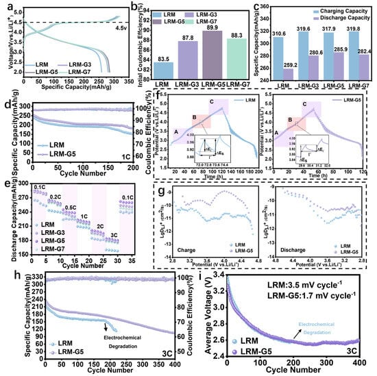 Electrochemical performance evaluation. (a) Initial charge/discharge profiles of LRM and LRM-G5 at 0.1 C. (b) Comparison of the ICE for all samples. (c) The charge and discharge capacities of all samples. (d,h) Cycling performance at 1 C over 200 cycles (d) and at 3C over 400 cycles (h) for LRM and LRM-G5. (e) Rate capability of LRM, LRM-G3, LRM-G5 and LRM-G7 at various rates. (f) GITT curve during charge/discharge. (g) Li+ diffusion coefficients calculated from GITT for LRM and LRM-G5. (i) Voltage decay comparison between LRM and LRM-G5.