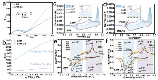 Electrochemical kinetics analysis. (a,b) Nyquist plots (a) and the corresponding Warburg impedance fitting curves (b). (c,d) CV curves of LRM (c) and LRM-G5 (d). (e,f) dQ/dV curves of LRM (e) and LRM-G5 (f).