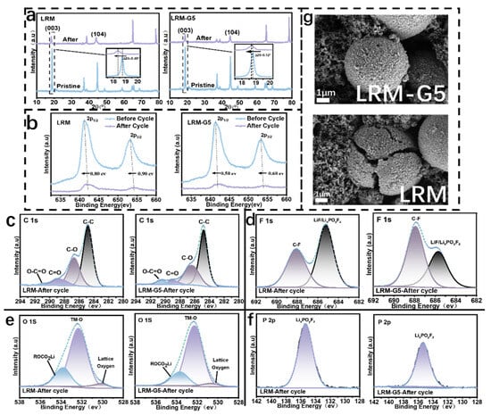 XPS orbital deconvolution in Figure 6c–f provides further insights into the uniformity of the CEI and the extent of electrolyte decomposition. In the C 1s spectra, the higher intensities of C=O and C–O species for LRM, together with the stronger ROCO2Li signal in the O 1s spectra, indicate a thicker CEI enriched with organic components [49]. This feature reflects intensified interfacial side reactions, leading to increased electrolyte/electrode interfacial resistance and continuous consumption of active materials. The F 1s spectra further support this conclusion, as the higher binding energy associated with C–F bonds in LRM-G5 suggests a lower degree of electrolyte–electrode interfacial degradation compared with LRM. The LiF/LixPOyFz species originate from the decomposition of the LiPF6-based electrolyte [50], and the higher binding energy observed for LRM implies more severe interfacial corrosion and more pronounced parasitic reactions. Consistently, the presence and intensity of LixPOyFz decomposition products in the P 2p spectra further corroborate this interfacial degradation behavior. Notably, after cycling, LRM-G5 exhibits stronger TM–O bonding compared with LRM, which can be attributed to the thicker CEI layer and more pronounced structural degradation in LRM that weakens the intrinsic metal–oxygen framework.