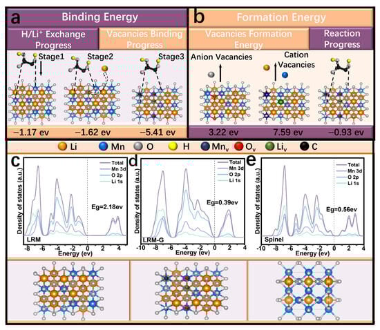 Theoretical calculations and structural analysis. (a) Binding energy comparisons and the corresponding schematic of reaction energetics. (b) Vacancy formation energy comparisons and the associated schematic of reaction pathways. (c–e) Density of States (DOS) for the pristine LRM (c), modified LRM-G (d), and the spinel phase (e).