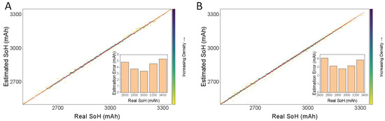 Figure 3 summarizes the cycle-level SoH estimates produced by the proposed framework for both the NCA and NCM cohorts across the nine operating conditions. For the NCA group (Figure 3A), the model attains high accuracy with MAE = 0.12% and RMSE = 0.20%. The largest errors occur in the early ageing stage, particularly when the measured maximum capacity falls within the 3200-3300 mAh range. We attribute this behaviour to an initial SEI-formation period in NCA cells, during which interfacial electrochemical properties are unstable, and the model struggles to track the incipient ageing trajectory. Accuracy improves markedly in the middle stage of ageing. For the NCM group (Figure 3B), performance is even higher (MAE = 0.09%, RMSE = 0.16%), a result that we ascribe to the more homogeneous, SEI-dominated ageing mode of the NCM negative electrode. The relatively concentrated degradation pathways in NCM produce more consistent impedance-capacity mappings that are easier for a data-driven model to capture. By contrast, surface reconstruction and oxygen release phenomena on NCA positive electrodes introduce competing ageing mechanisms that broaden the degradation manifold and complicate feature learning. Nevertheless, the proposed model’s SoH estimates substantially outperform previously reported results on the same dataset [37,40,41]. For fair benchmarking on the KIT dataset, we compare our results with recent state-of-the-art results (Table 2). Zhu et al. report RMSE = 1.10% using XGBoost/ElasticNet/SVR; Xiang et al. obtain MAE = 1.47% and RMSE = 2.06% with a bi-GRU + GPR hybrid; another RNN-based Cerberus model (Xiang et al.) reports MAE in the range 0.29–5.14% across regimes. In contrast, our transformer encoder + XGBoost pipeline with impedance-based intermediate supervision yields MAE = 0.12% and RMSE = 0.20% on the same benchmark, demonstrating a clear empirical advantage and supporting the efficacy of embedding multidimensional EIS constraints.