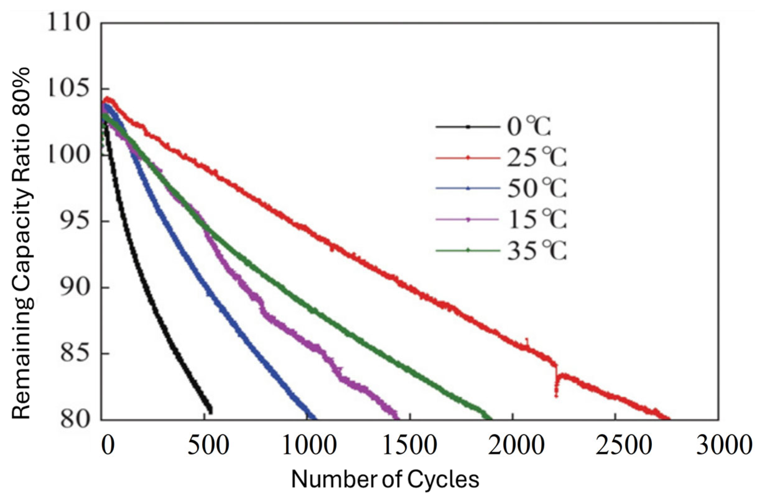 The second vital reason is durability, thus preserving battery life (degradation). Thermal battery life degradation is heavily driven by operating temperatures, with high heat (>40 °C) accelerating capacity fade through electrolyte decomposition and SEI layer growth, while extreme cold (<0 °C) causes lithium plating [6]. Optimal lifespans are achieved by maintaining cells within a 15–35 °C range, as degradation mechanisms differ significantly between high and low-temperature conditions. In fact, the chemical reactions inside the cell are designed to occur within an ideal range (usually between 15 °C and 35 °C). The excessive heat accelerates parasitic chemical reactions that consume active lithium and degrade the anode and cathode. This reduces the battery’s capacity over time. Cooling also serves to keep all cells at the same temperature. If some cells are hotter than others, they will wear out faster, unbalancing the entire pack and reducing its useful life [7]. The relationship between remaining battery capacity, cycle life, and temperature is complex, representing a trade-off between immediate performance (higher at warmer temperatures) and long-term degradation (faster at warmer temperatures). While warmer temperatures (e.g., 30–45 °C) can temporarily increase available capacity by reducing internal resistance, they simultaneously accelerate parasitic side-reactions that lead to faster, irreversible capacity loss over many cycles (see Figure 2 and Table 1).