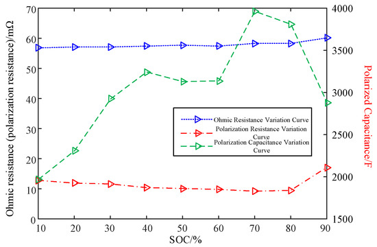 Ref. [26] reported the variation in internal characteristic parameters under different states of charge, as shown in Figure 2.