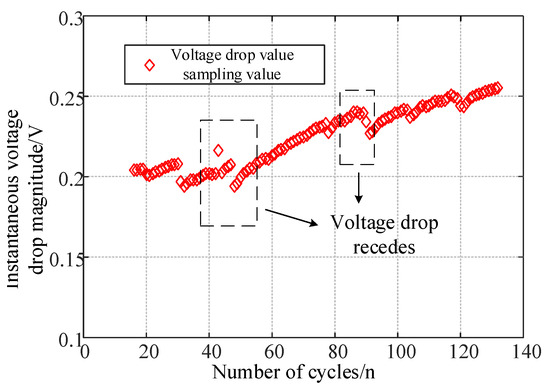 where a and b are considered as degradation factors. As the number of cycles increases, the voltage drop amplitude shows an increasing trend, so let: