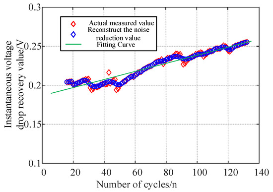 To prove the effectiveness of the proposed method, the pressure drop data of the 70#C to 110#C cycle of B0006# in NASA aging data was reconstructed and denoised using Bezier curves. The method was compared and analyzed with the data fitting method for smoothing the data. The data fitting used a third-order fitting function, and the smoothing denoising effect is shown in Figure 4.