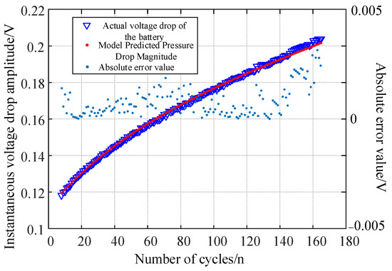 Equation (14) is the expression of the degradation model for the actual sharp voltage drop amplitude Δuohm and the cycle number C. The unknown parameters in the equation are: α, β, γ, and k. This paper sets the battery operating condition to a constant-current charge–discharge process, and uses a nonlinear curve fitting method to determine the unknown model parameters. By setting a threshold for the sharp voltage drop amplitude, the prediction of battery SOH can be achieved.