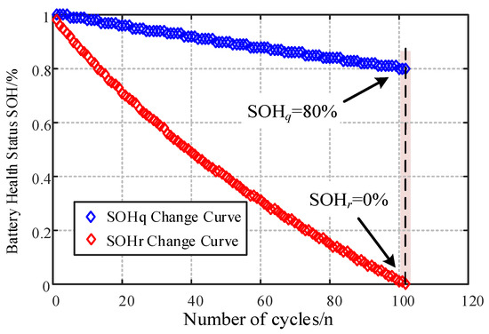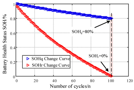 In the formula, Q0 is the initial rated capacity (A·h) of the lithium-ion battery, and Qt is the actual capacity (A·h) at time t; r0 is the initial ohmic resistance value; rt is the ohmic resistance value under the current operating conditions; reol is the ohmic resistance value of the battery at the end of its lifespan. In the actual operation of the energy storage station, it is mostly in the constant-current peak shaving and valley filling mode. Therefore, in the constant-current charging and discharging aging process of this paper, by multiplying both the numerator and denominator of Equation (15) by the current i, the following formula can be further obtained.