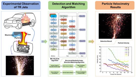 To construct efficient safety warning systems, researchers must understand the physical mechanisms governing the TR propagation [5]. During the violent eruption phase, a high-pressure mixture of gas and liquid entrains a large volume of high-temperature solid particles to form a high-speed multiphase jet [6,7], as illustrated in Figure 1. These solid particles act as primary vectors for hazard propagation. According to the kinetic energy theorem, the destructive potential of these particles scales with the square of their velocity, allowing them to penetrate adjacent cell safety valves or damage module structures [8,9]. Furthermore, these high-enthalpy particles act as mobile ignition sources that can ignite combustible electrolyte vapors and trigger a cascading failure across the entire battery pack. Prior research has explored particle velocimetry in extreme environments, ranging from high-enthalpy aerospace flows requiring spectral filtering [10] to battery venting scenarios utilizing traditional PIV techniques [11]. However, the unique combination of intense flame-induced background interference and extreme particle density in thermal runaway jets necessitates the development of specialized small-object detection algorithms to ensure reliable measurements in such harsh conditions. Consequently, precise and real-time velocity measurement of these micro-particles provides the essential physical data needed to assess impact damage, reveal fire spread patterns, and optimize module safety spacing [12].