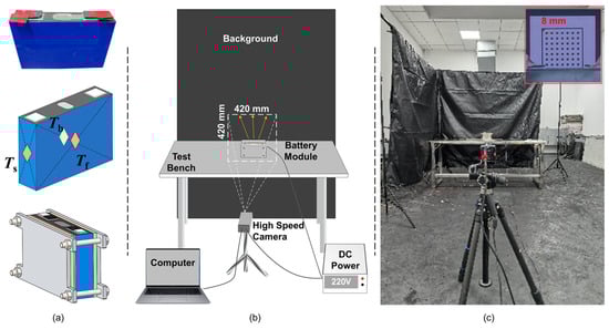 Experimental setup and data acquisition system. (a) Battery specimen preparation; (b) Schematic diagram of the high-speed imaging system; (c) Physical experimental environment.