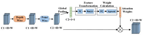 Within this structure, input features are initially processed via depth-wise convolution. By splitting the input into multiple groups for independent convolution, this strategy significantly enhances model generalization and reduces parameter count. Subsequently, point-wise convolution is employed to reconstruct associations between feature maps by weighting the convolutional kernels. Finally, a channel attention mechanism is applied to the output. This mechanism differentiates channel importance by amplifying contributions from channels containing key information while suppressing noise and redundancy, thereby achieving more precise extraction of target features.