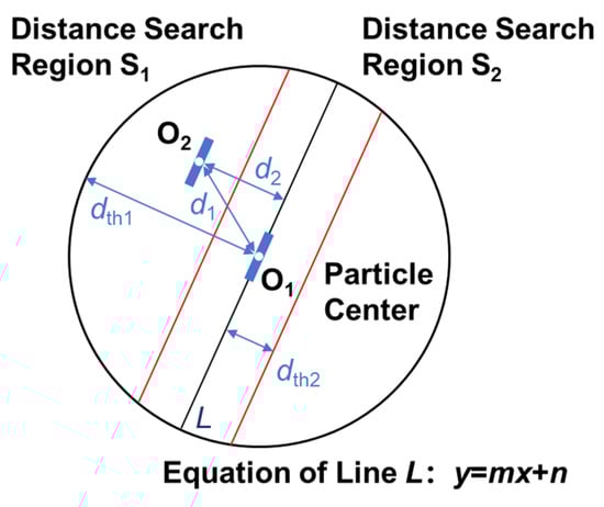 Region S1 imposes a distance constraint where the threshold dth1 is a spatial limit determined by the estimated maximum particle velocity and the inter-frame interval. Similarly, region S2 imposes a directional constraint, where the threshold dth2 defines the allowable lateral deviation of a candidate particle from the projected linear trajectory L. These parameters collectively ensure the precision of the matching task in dense particle scenes. The condition for a candidate O2 to fall within S1 is: