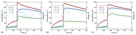Based on the established protocol, the temporal evolution of temperature and voltage for the three test groups is presented in Figure 10. The temporal origin is synchronized with the activation of the external heating power. During the initial heating phase, the battery exhibited no signs of violent internal reaction. The voltage remained stable, indicating that the structural integrity and electrochemical state of the cell were preserved under the external thermal load.