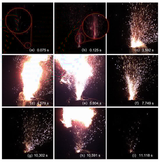 Figure 11 depicts the sequential images captured by the high-speed camera. The bright trajectories observed correspond to solid particles naturally ejected during the TR process. These particles became self-luminous due to extreme temperatures, eliminating the need for external illumination or artificial tracers. This self-luminescence ensures that the measurements faithfully reflect the dynamics of the battery material itself without artifacts from added substances. The ejected solid phase consists primarily of positive electrode particles and fragments from the aluminum and copper current collectors. Due to their high drag and low mass, the foil fragments follow the high-speed gas flow closely and serve as effective tracers for the aerodynamic field. In contrast, the denser electrode particles maintain significant momentum and represent the ballistic component of the jet core.