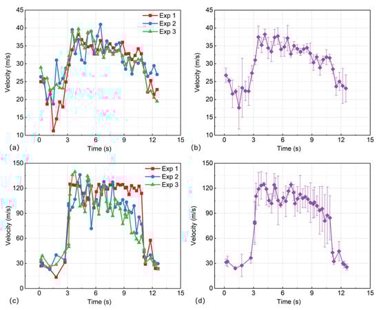 Time-history of particle velocity during the TR eruption. (a) Average velocity; (b) Mean ± standard deviation of average velocity; (c) Maximum velocity; (d) Mean ± standard deviation of maximum velocity.