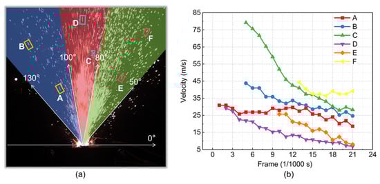 To investigate the velocity attenuation characteristics of individual particles, the jet field was divided into three angular sectors relative to the safety valve center (Figure 14a): a green edge diffusion zone (50°~80°), a red central jet zone (80°~100°), and a blue edge diffusion zone (100°~130°). Two typical particles were tracked within each zone over 20 consecutive frames (1/150 s). The velocity profiles are plotted in Figure 14b.