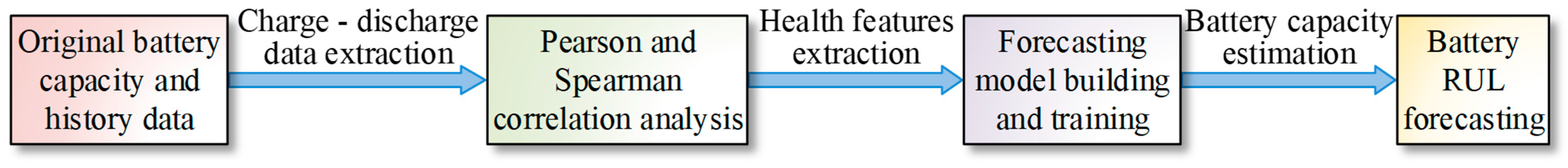 4], significantly impairing charge–discharge performance and potentially leading to malfunction or even safety accidents under extreme conditions. Accurate prediction of battery RUL can provide critical guidance for preventive maintenance and safe, stable operation, reduce maintenance costs, and mitigate the risk of catastrophic failures [