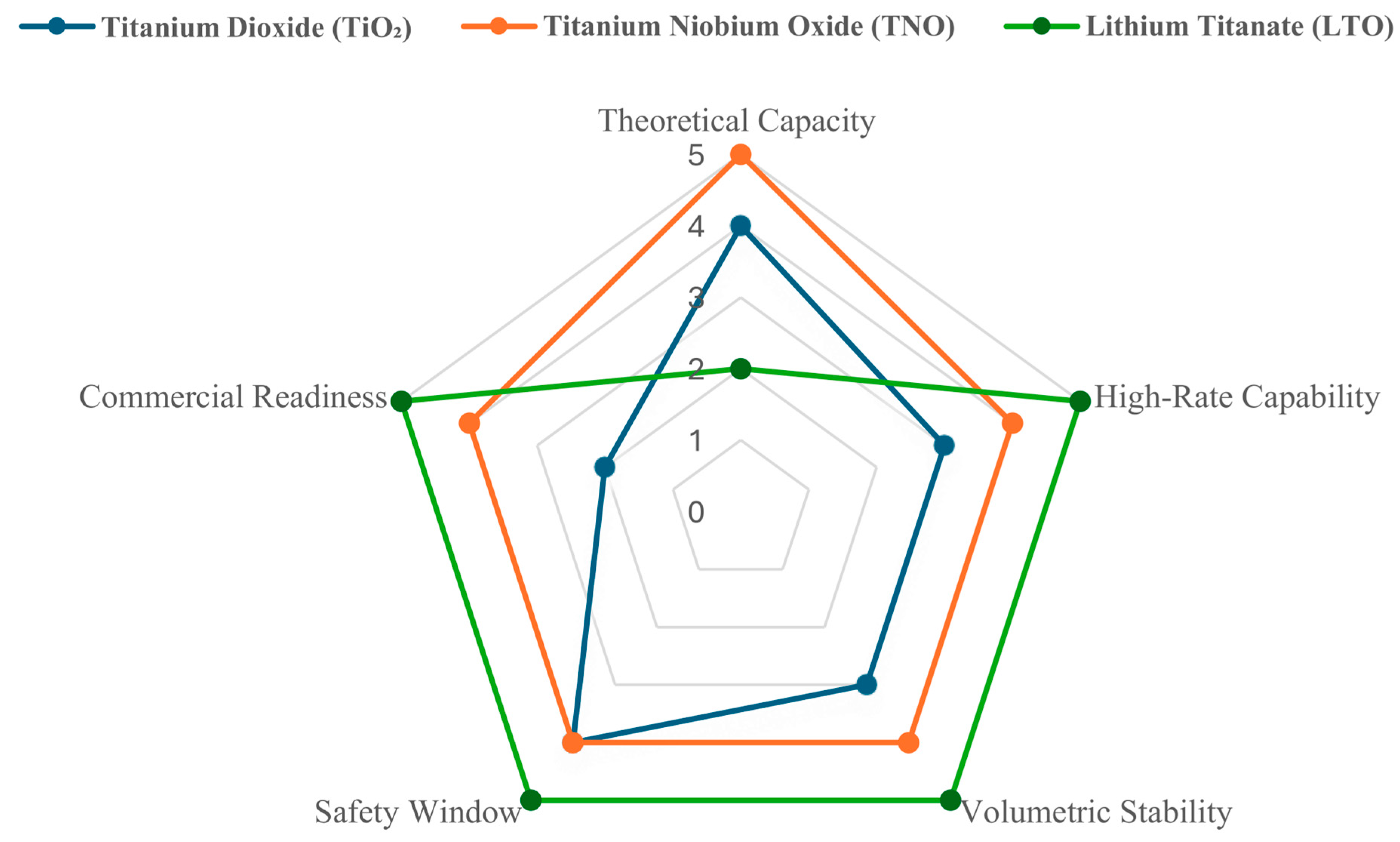 - Wadsley–Roth titanium niobium oxides uniquely integrate open crystallographic channels, multi-electron redox chemistry (Nb5+ + 2e− ⇌ Nb3+), and minimal volume change. Consequently, they emerge as arguably the best balanced Ti-based candidates currently evaluated under rigorous XFC constraints, offering an optimal trade-off between power capability, practical energy density, and intrinsic safety. Nonetheless, the extensive commercialization of Wadsley–Roth TNOs encounters significant challenges, chiefly the elevated raw material costs and the limited availability of niobium in contrast to titanium, as well as the synthesis complexities required to achieve optimal nanostructured architectures at an industrial scale.