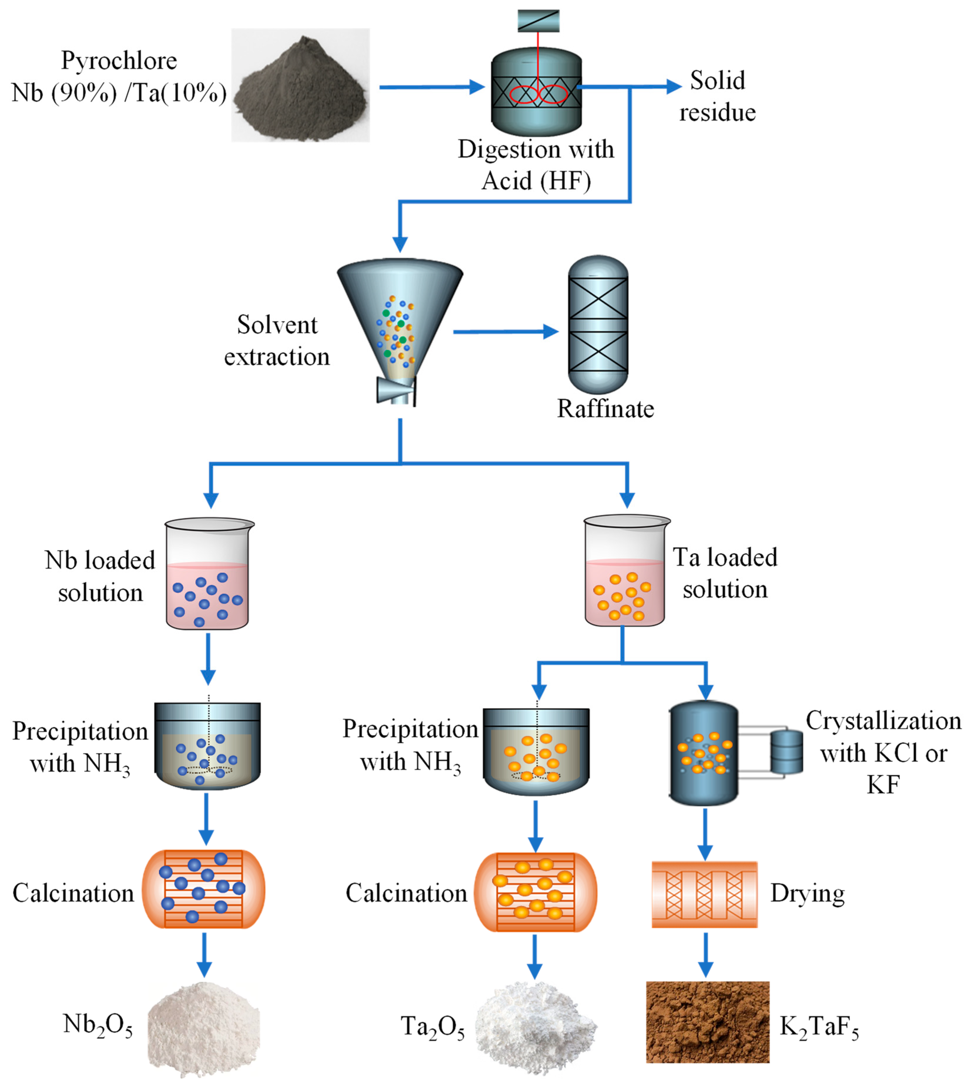 - Zhu, Z.; Cheng, C.Y. Solvent extraction technology for the separation and purification of niobium and tantalum: A review. Hydrometallurgy 2011, 107, 1–12. [Google Scholar] [CrossRef]
