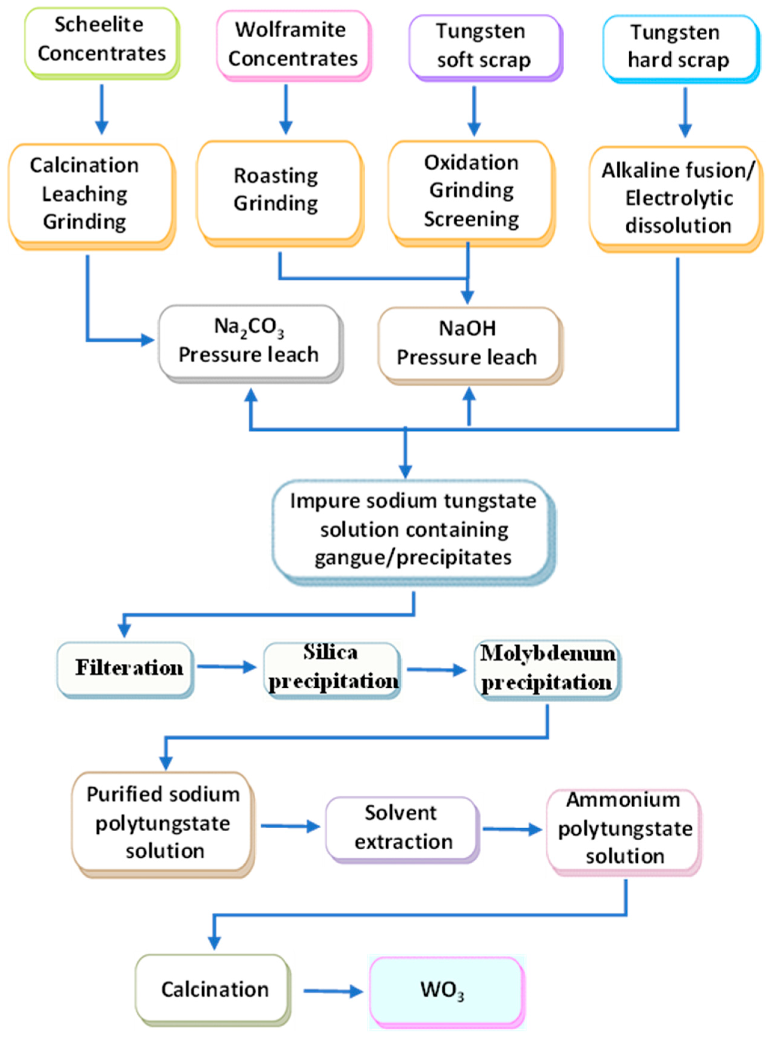 - Nieto, J.; Yurramendi, L.; Antoñanzas, J.; Aldana, J.L. High-Purity Tungsten Oxide Production from Low-Grade Scheelite Concentrates at Pilot Plant Scale. Metals 2025, 15, 1051. [Google Scholar] [CrossRef]