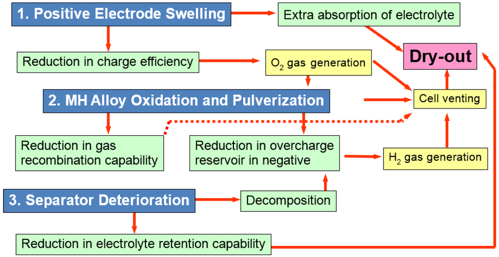 Schematic diagram of three key factors leading to the major failure mode of nickel/metal hydride (Ni/MH) cells—electrolyte dry-out.