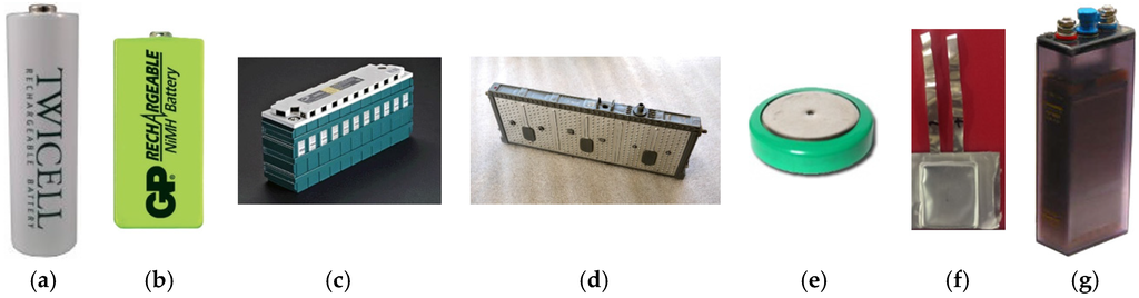 Ni/MH batteries in: (a) cylindrical; (b) stick; (c) metallic prismatic; (d) plastic prismatic; (e) button; (f) pouch; and (g) flooded configurations.