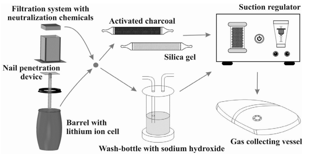 - Catching fire: a single bare lithium ion cell is mounted within the barrel. The barrel is shut partly by a cover, which prevents the barrel from explosion but retains most of the emission gases. PTFE tubing leads the gas mixture to the analytics.