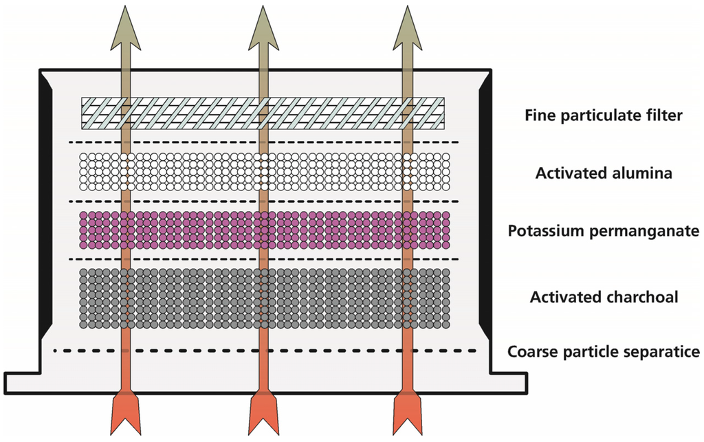 Schematic drawing of the filtration unit setup; five filtration stages are used. The size of the filtration unit is about 30 × 30 × 60 cm³.