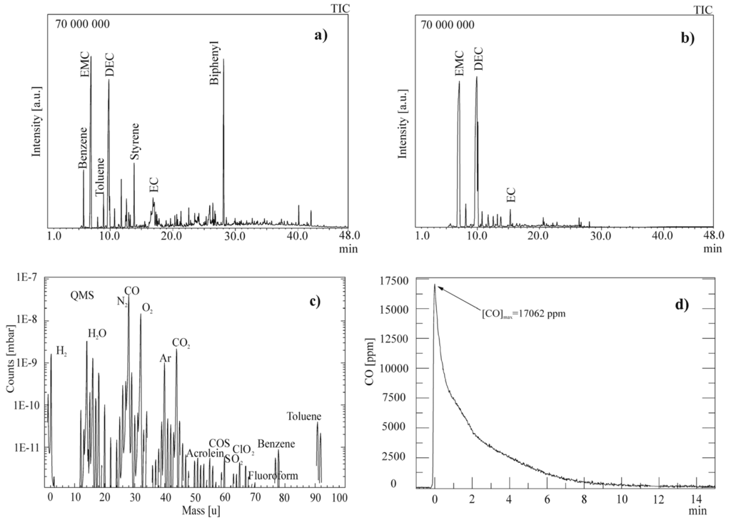 For each experiment an emerging gas amount of approximately 200 SL (5 SL/Ah) caused by the induced thermal runaway was observed. Figure 3 shows the retrieved data from GC-MS, QMS, and QEPAS for the measurements of Scenario 2. These graphs were chosen exemplarily, as the gas mixtures from Scenario 2 show far more variety and concentration of hazardous substances—155 in all. It can be seen that most substances appear in the GC-MS spectrum retrieved from the charcoal sample (Figure 3a), whereas far fewer components adsorb on silica (Figure 3b). In the QMS-spectrum, the expected composition of atmospheric air mixed with the species from the battery emission can be seen. Although the in situ measurement with the QEPAS-sensor was performed only for Scenario 2, it shows a good insight of the temporal behavior of the process, starting with the emission peak shortly after the nail penetration and nearly exponentially decaying over time. Furthermore, it underlines the high CO content detected by QMS for Scenarios 2 and 3.