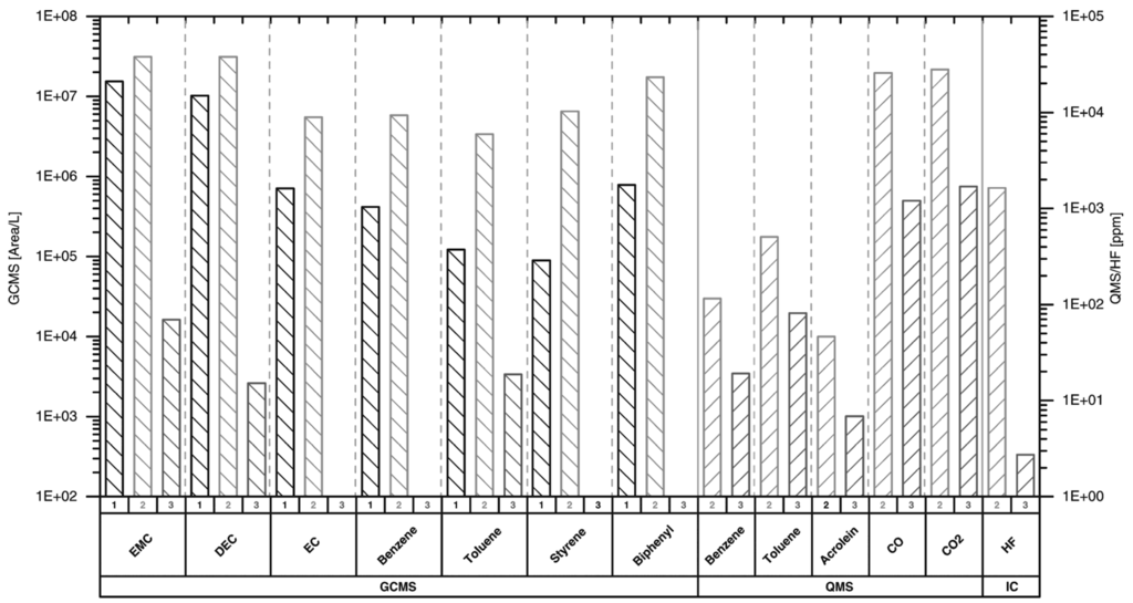First investigations on the emission gases from lithium ion cells and former works [,,] showed, that a large variety of species were to be expected. As no state-of-the-art analysis system is known that is capable of a cross-sensitivity free detection of all expected emission components, different spectroscopic and chemical analysis techniques were combined. Gas chromatography-mass spectrometry (GC-MS) was used to detect larger molecules, mainly volatile organic compounds, starting from about four carbon atoms per molecule. Smaller components were determined via quadrupole mass spectrometry (QMS), starting from 1 u. In order to get insight in the time dependence of the reaction, an optical sensor based on quartz-enhanced photoacoustic spectroscopy (QEPAS) was used to detect CO, exemplarily. For its radical behavior, HF was determined chemically via ion chromatography (IC) and conductivity measurements. In order to suppress reactions with other species before its detection the HF was dissolved in wash bottles; see Section 2.2.3 for details. It is assumed that all detected fluoride ions result from dissociated HF.