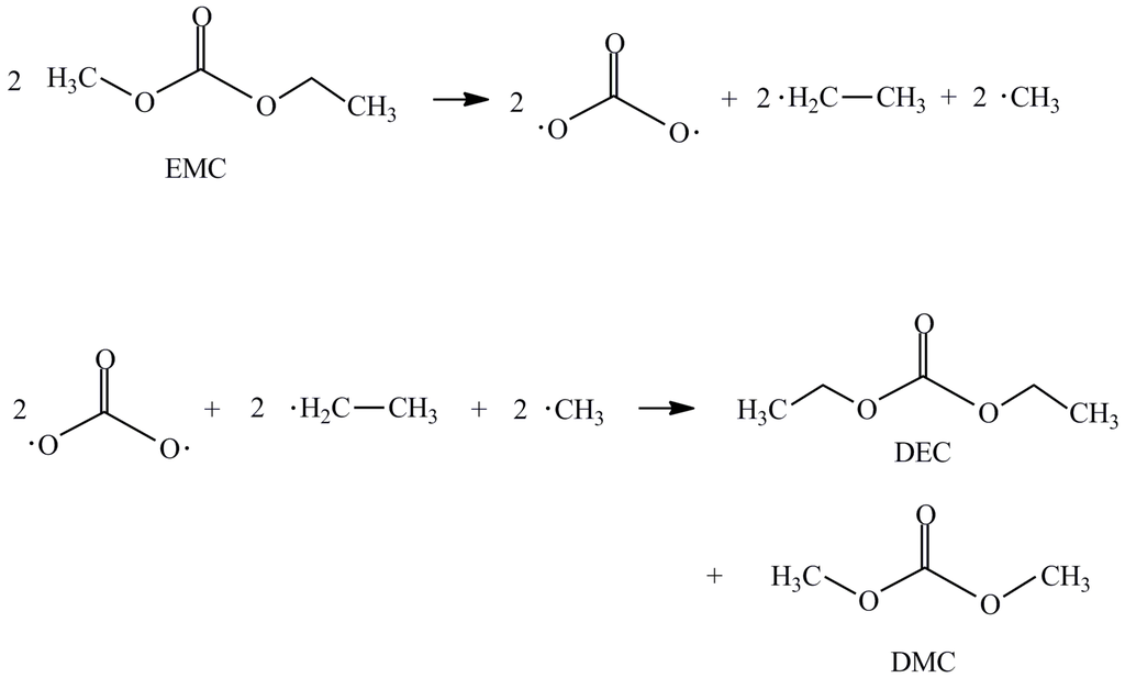 Homolytic cleavage and radical combination can form DEC and DMC from EMC.