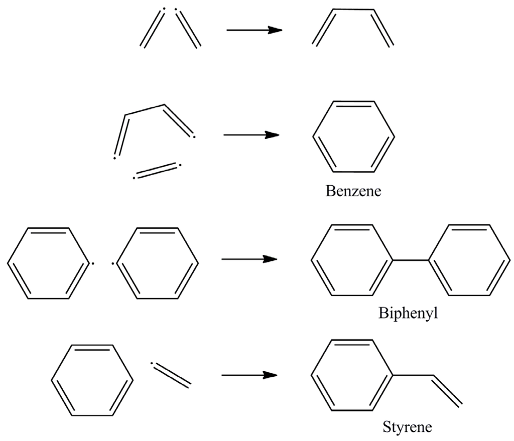 Four exemplary radical reactions that form benzene, biphenyl, and styrene. More reactions underlying similar principles lead to the large amount of different aromatic constituents that were found [].