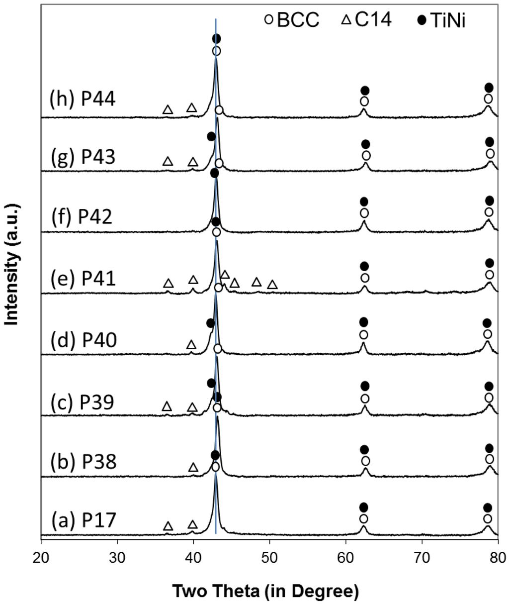 X-ray diffraction (XRD) patterns of alloys (a) P17; (b) P38; (c) P39; (d) P40; (e) P41; (f) P42; (g) P43; and (h) P44. The vertical line highlights the shifts of the main body-centered-cubic (BCC) and TiNi peaks.